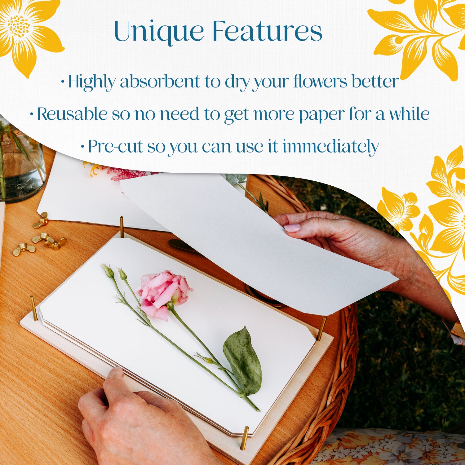 🌼 Better and more even drying of your flowers. Our specialist blotting sheets are designed to soak up excess moisture from your pressed flowers so they'll dry evenly, reducing the risk of molding and ruining your blooms.
